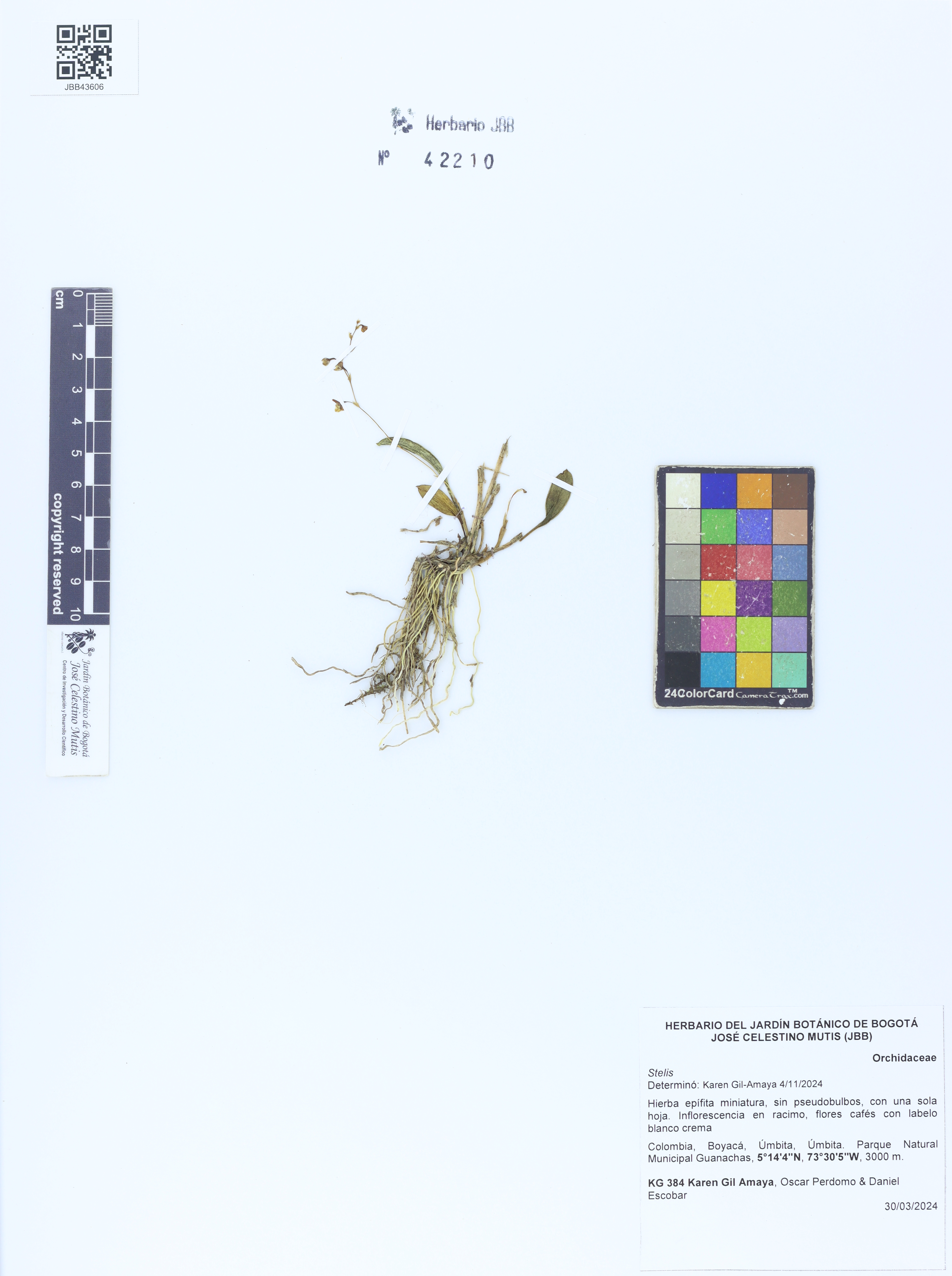 Plant description Hierba epífita miniatura, sin pseudobulbos, con una sola hoja. Inflorescencia en racimo, flores cafés con labelo blanco crema