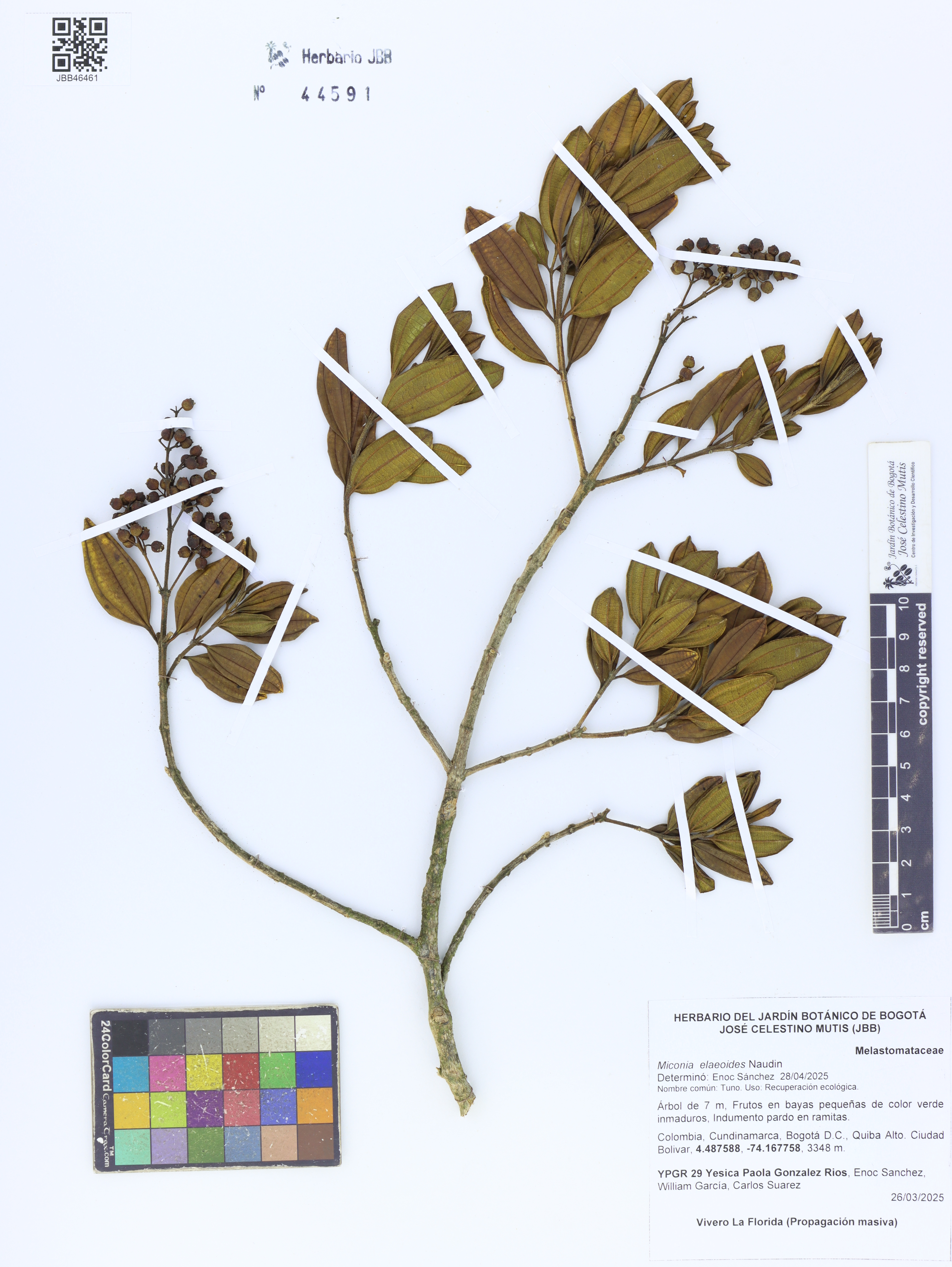 Plant description Árbol de 7 m, Frutos en bayas pequeñas de color verde inmaduros, Indumento pardo en ramitas.